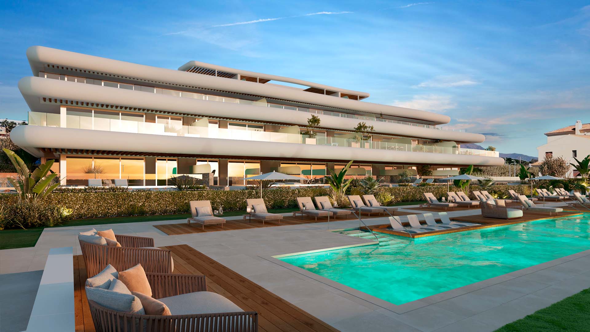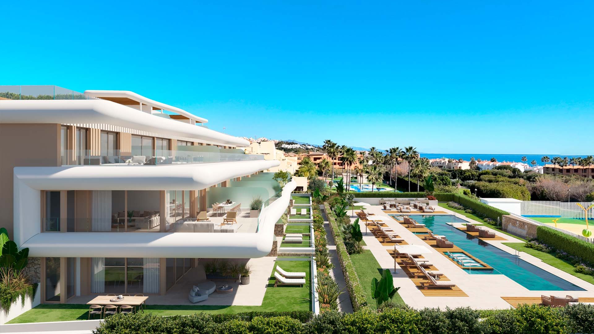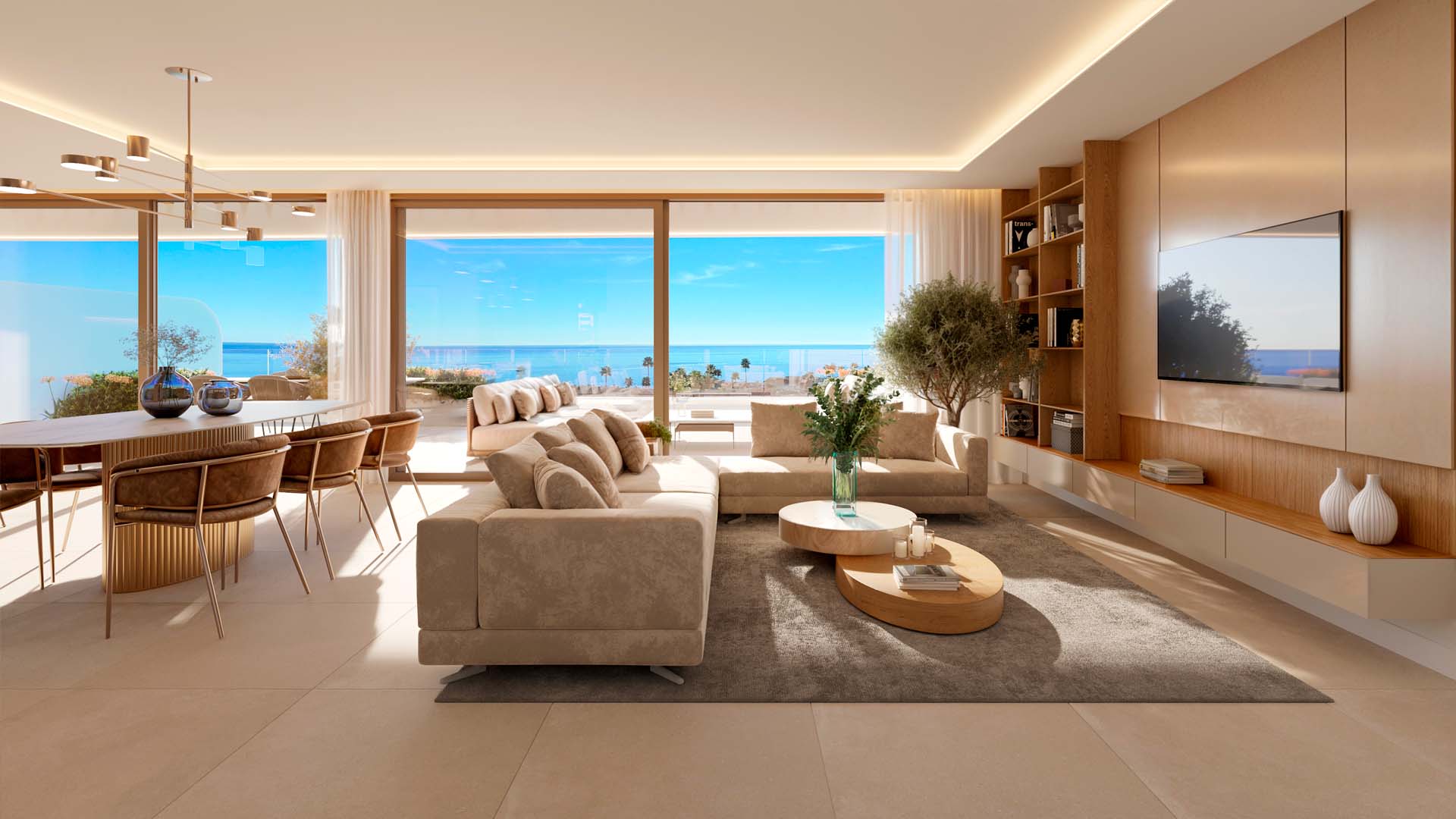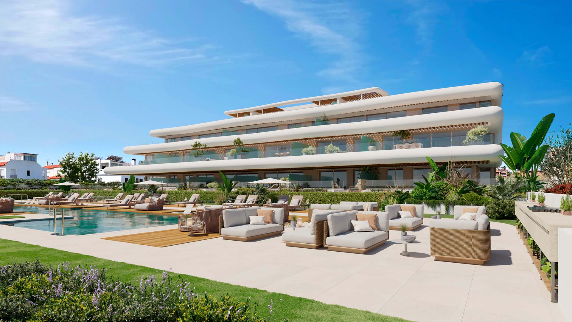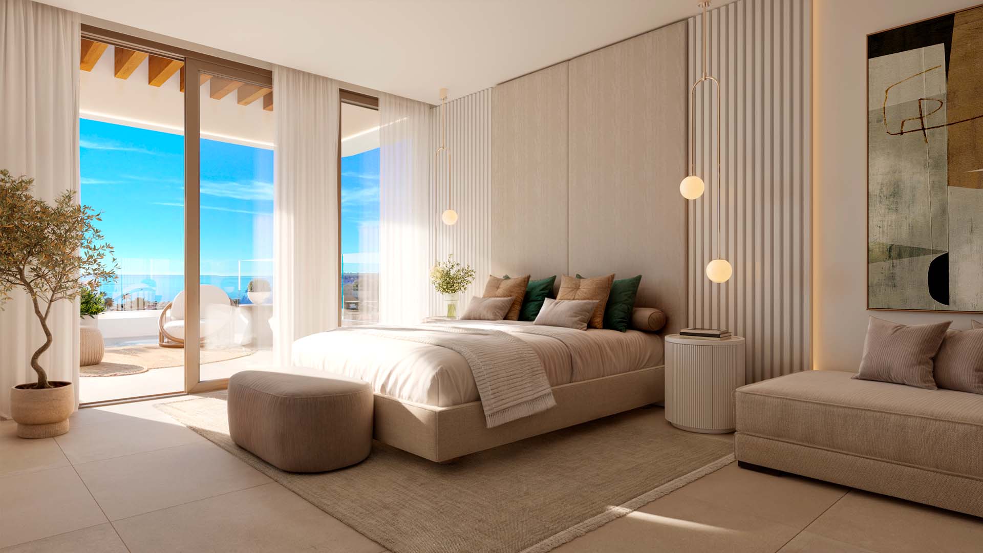 Apartamentos con grandes terrazas y ventanales que potencian la luz natural y la conexión con el entorno.